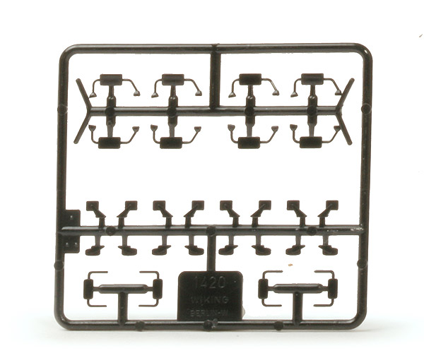 Grundfarbe | schwarz | Prägung | "1420, WIKING, Berlin-W" | | Spiegel am Spritzling: | 2-armig asymmetrisch | 8 Stück (mit Füßchen) | 1-armig eckig | 8 Stück | 1-armig gerundet | 8 Stück | 2-armig ca. symmetrisch | 4 Stück (zum Einstecken) | | Link | anderer Spritzling | ohne Füßchen |