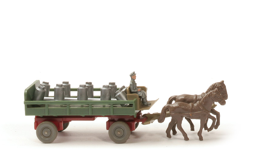 | Typ | Rollachser | | Farbe Pritsche | diamantgrün | | Pritschentyp | mit Rückleuchten und hinterem Kennzeichen | | Chassis | hellbraunrot, ohne Zughaken ähnlich | | Chassis Bodenprägung | ohne | | Drehschemel | hellbraunrot | | Befestigung Drehschemel | Bajonettverschluss | | Achshalterungen | offen | | Kutschbock | sandbraun, verstärkte Vorderkante | | Deichsel | sandbraun, neue Befestigungs-Konstruktion | | Farbe linkes Pferd | ca. blassbraun | | Farbe rechtes Pferd | ca. blassbraun | | Kutscher Farbe | blaumetallic | | Kutscher Bemalung | Gesicht, Hände | | Ladung | 10 Milchkannen am Spritzling | | Räder | 10mm, neuere Ausführung |