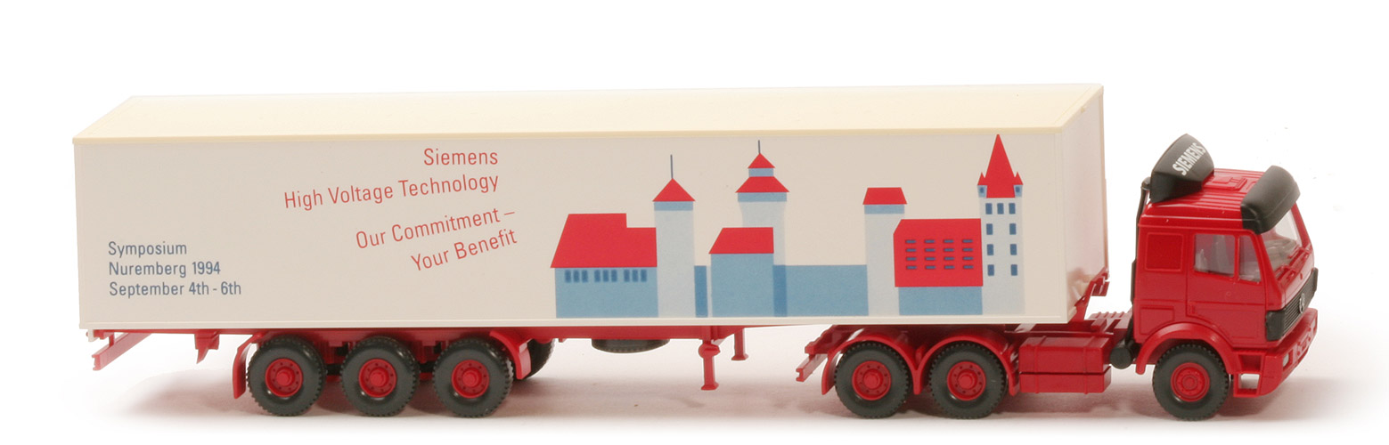 | Zugmaschine | Fahrerhaus | rot | Inneneinrichtung | lichtgrau mit separat eingesetztem Lenkrad | Scheibenwischer | plastisch | Grill | schwarz, Stern groß silbern bedruckt | Kotflügel vorne, Stoßstange | rot | Scheinwerfer | silbern eingesetzt | Ansaugstutzen | schwarz, hinter Kabinenrückwand | Chassis | rot, detailiert, offen | Chassis Bodenprägung | WIKING - neues Logo | Radlauf hinten | rot, 2-teilig | Reserverad | unter Chassis | Räder | 12 mm, Profil grob | Felgen | 8-Loch, rot | | Auflieger | Koffer Korpus | weiß | Dach | helles cremeweiß | Türen | weiß | Beschriftung | Symposium Nurem(!)berg, ... 1994 Häuser | Beschriftung Art | Druck | Bodenprägung Koffer | neues WIKING-Logo, Germany | Chassis | rot | Unterfahrschutz hinten | rot | Drei-Achsaggregat Farbe | rot | Achsaggregat Typ | Kotflügel rund | Achhalterung | rot | Hydraulikstütze | rot | Unterfahrschutz seitlich | ohne | Räder | 12 mm, Profil grob | Felgen | 8-Loch, rot |