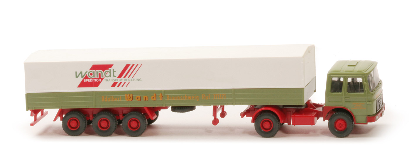 | Zugmaschine | Fahrerhaus | helles resedagrün | Verglasung | klar | Inneneinrichtung | ca. basaltgrau, mit Lenkrad | Spiegel | mit | Scheibenwischer | mit | Lüftergitter | ohne | Grill | schwarz, mit Löwe | Motorblock | schwarz | Chassis | "karminrot" | | Auflieger | Art | 4-fach-Teilung | Farbe Pritsche | helles resedagrün | Pritsche Druck | "Adalbert Wandt Braunschweig Ruf 311321" | Pritsche Bodenprägung | Wiking, Berlin-W | Chassis | "karminrot" | Pritscheneinlage | Pappe, silbern | Plane | weiß | Druck | "Wandt Spedition", "´Transportberatung" | Stützen | als Rollen | 3-Achsaggegat Farbe | "karminrot" | 3-Achsaggegat Typ | Kotflügel eckig | Heck | gerade | Warndreiecke | neben Rückleuchten | Räder | 12mm, Profil grob | Felgen | "karminrot" |