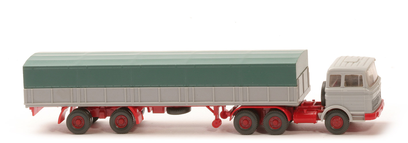 | | Zugmaschine | | Typ | Dach querversteift | | Kabine | lichtgrau | | Spiegel | ohne | | Scheibenwischer | ohne | | Verglasung | klar | | Lenkrad | ohne | | Inneneinrichtung | ca. hellgelbgrau | | Stoßstange | rot, Scheinwerfer ungesilbert | | Chassis | rot | | Zentriernippel für Pritsche | mit | | Radlauf hinten | einteilig rot | | Reserverad | ohne | | Sattelpfanne | für großen KöBo | | Räder | Profil grob | | Felgen | hellbraunrot | | | Auflieger | | Pritsche Farbe | silbergrau | | Chassis Farbe | rot | | Pritscheneinlage | Pappe, silbern | | Plane Farbe | patinagrün | | Reserverad | unter Auflieger, gesteckt | | Unterfahrschutz | ohne | | Königsbolzen | stark | | Räder | Profil grob | | Felgen | hellbraunrot |