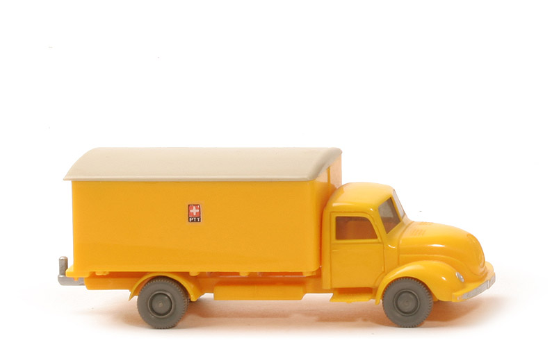 | Farbe Kabine | gelb | | Version Kabine | Typ 4 | | Stoßstange | senkrecht | | Kabinenboden | mit Schlitz | | Blinker | ohne | | Dach | glatt | | Verglasung | getönt | | Bemalung | Scheinwerfer und Stoßstange | | Chassis Farbe | gelb | | Chassis Art | Variante 2 | | Achshalterungen | geschlossen | | Chassis Bodenprägung | nur WM (ohne Kreis) | | Zughaken | silbern eingesetzt | | Rückleuchten am Chassis | ohne | | Koffer Farbe | gelb | | Koffer | Typ 2a | | Rückleuchten | alt, rot bemalt | | Positionslichter vorn | ohne | | Türaufnahmen | unten geschlossen | | Türen Farbe | gelb | | Türen Typ | Griff als Lasche, ohne Rand | | Dach | glatt, ohne Rand und Positionsleuchten | | Dach Farbe | hellgelbgrau | | Nummerschild | am Koffer, silbern | | Beschriftung | PTT (...siehe Foto) | | Beschriftung Art | Druck | | Räder | 10mm neu |