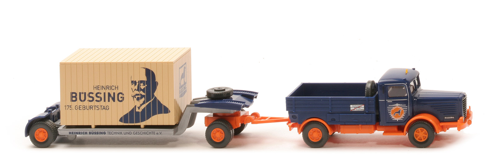 | Zugmaschine | Kabine | stahlblau | Verglasung | klar | Inneneinrichtung | ca. weinrot | Bedruckung Scheinwerfer | silbern | Bedruckung Grill | silbern, schwarz hinterlegt | Warndreieck | gelb | Koflügel vorne | rotorange | Chassis Farbe | rotorange | Sattelpfanne | für großen Königsbolzen | Bodenprägung | neues Wiking-Logo, Germany | Zughaken | grazil | Reserverad | ohne | Koflügel hinten | rotorange | Pritsche | stahlblau, Reserverad stehend verklebt | Pritscheneinlage | ohne | Räder Typ | 12 mm, Felgen eingesetzt | Felgen | Trilex, rotorange | | Anhänger | Grundfarbe | silbern | gesteckte Rampe | stahlblau | gesteckter Radsatz | stahlblau | Pritsche | dunkles basaltgrau, ohne Dorn | Bodenprägung | neues WIKING-Logo, Germany | Drehschemel | capriblau, Befestigung über Weichzapfen | Reserverad | über Drehschemel | Holzkiste | helles beige, BP neues WiIKING-Logo | hier Druck Seiten | "Heinrich Büssing 175. Geburtstag", Portraitbild | hier Druck vorne/ hinten | Büssing-Logo | Räder Typ | 12 mm, Felgen eingesetzt | Felgen | Trilex, rotorange |