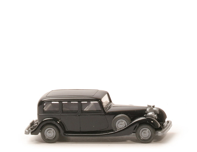 Farbe | schwarz | Grill | silbern eingesetzt | Reserveräder | auf vorderen Kotflügeln | Inneneinrichtung | ca. lichtgrau | Lenkrad | eingesetzt | Bemalung Rückleuchten | ohne | Chassisfarbe | silbern | Bodenprägung | Horch 850, WIKING, Berlin-W | Räder | 9 mm | Radkappen | silbern eingesetzt |