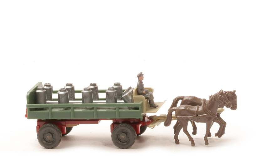 Typ | Rollachser | Farbe Pritsche | diamantgrün | Pritschentyp | mit Rückleuchten und hinterem Kennzeichen | Chassis | hellbraunrot, mit Zughaken, Normchassis Typ 5 | Chassis Bodenprägung | WIKING, Germany | Drehschemel | hellbraunrot | Befestigung Drehschemel | Bajonettverschluss | Achshalterungen | offen | Kutschbock | ca. hellgelbgrau, verstärkte Vorderkante | Deichsel | ca. hellgelbgrau, neue Befestigungs-Konstruktion | Farbe linkes Pferd | braun | Farbe rechtes Pferd | braun | Kutscher Farbe | ca. basaltgrau | Kutscher Bemalung | Gesicht, Hände | Ladung | 10 Milchkannen am Spritzling | Räder | 11 mm, Standard-Räder, 6-Loch |