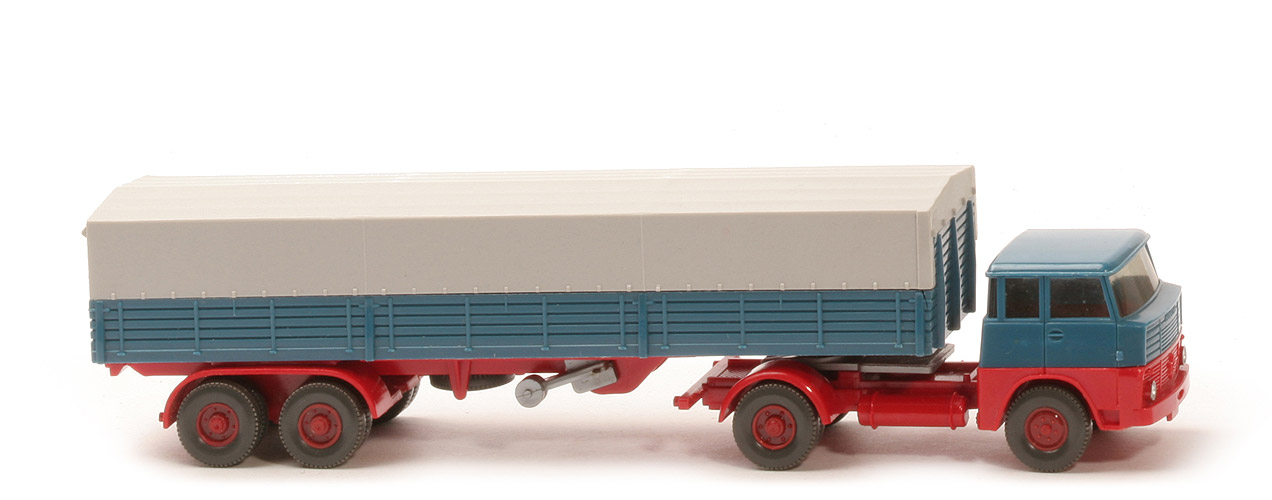 | Zugmaschine | Kabine oben | azurblau | Kabine unten | rot | Verglasung | getönt | Stege für Inneneinrichtung | mit | Chassistyp | neu | Zughaken | ohne | Fläche hinter Sattelpfanne | geriffelt | Chassisfarbe | rot | Sattelpfanne | für kleinen Königsbolzen | Reserverad | ohne | Räder | 12mm, Profil fein | Felgen | hellbraunrot | | Auflieger | Farbe Pritsche | azurblau | Pritschentyp | ohne Lasche | Chassis | rot | Prägung Chassis | Wiking - schemenhaft 51 h | Pritscheneinlage | silber | DAA | Version 3a: Klemmplatte rot | Bodenprägung Achseinheit | Germany/Wiking | Königsbolzen | dünn, eingesetzt, pilzförmig | Stütze | beweglich | Plane | Seite 2 Mark., vorne Aussparung | Plane Farbe | ca. lichtgrau | Räder | 12mm, Profil fein | Felgen | hellbraunrot |