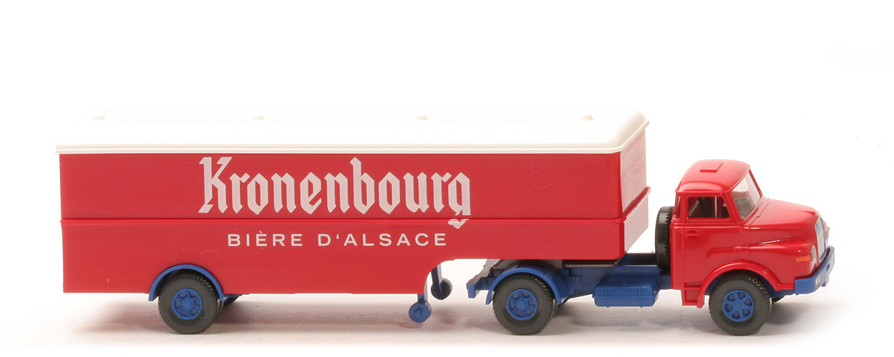 | Zugmaschine | Farbe Kabine | rot | Verglasung | klar | Inneneinrichtung | ca. anthrazit, Lkr integriert | Grill Ausführung | Druck, ca. maritimblau | hier Beschriftung | Saviem (!) | Bedruckung Front | Scheinwerfer, Zierlinien silbern | Bedruckung Blinker | orange | Chassis | ca. maritimblau | Kardanelement | ca. maritimblau | Bodenprägung | neues WIKING-Logo, Germany | Reserverad | hinter Kabine | Sattelpfanne | alt, mit Steg, für großen KöBo, ähnlich | Räder | 12 mm, Felgen eingesetzt | Felgen | neue Trilex-Felgen, ca. maritimblau | | Auflieger | Farbe Dach | weiß | Farbe oben | rot | Farbe unten | rot | Türen | rot, neu (mit Scharnierdarstellung) | Rückleuchten | kurz | Königsbolzen | stark | Radlauf hinten | ca. maritimblau | Stützen | ca. maritimblau | Reserverad | gesteckt auf Halterung | Beschriftung | Kronenbourg, Bière ... (s. Foto) | Räder | 12 mm, Felgen eingesetzt | Felgen | neue Trilex-Felgen, ca. maritimblau |