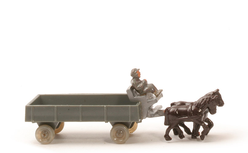Räder | Drahtachser | Pritschentyp | ohne Querverbretterung | Farbe Pritsche | betongrau | Deichselrest | mit | Pritschenboden | glatt | Zughaken | ohne | Deichsel/Kutschbock | silbern | Quersteg Deichsel | mit | Farbe linkes Pferd | dunkles schokobraun | Farbe rechtes Pferd | dunkles schokobraun | Kutscher Typ | Mütze | Kutscher Farbe | ca. umbragrau misch | Kutscher Bemalung | Gesicht, Hände | Räder | transparent hellgrau |