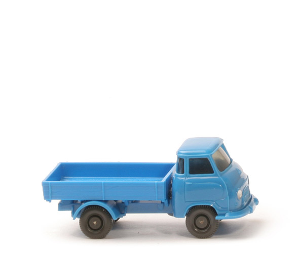 Kabine | lichtblau | Verglasung | getönt | Bemalung Scheinwerfer | silber | Bemalung Grill | ohne | Bemalung Kennzeichen | ohne | Inneneinrichtung | ohne | Chassis | lichtblau | Bodenprägung | ohne | Pritsche | himmelblau | Rückleuchten | unbemalt | Nummernschild hinten | unbemalt | Plane | basaltgrau | Räder | 9mm, glatt |