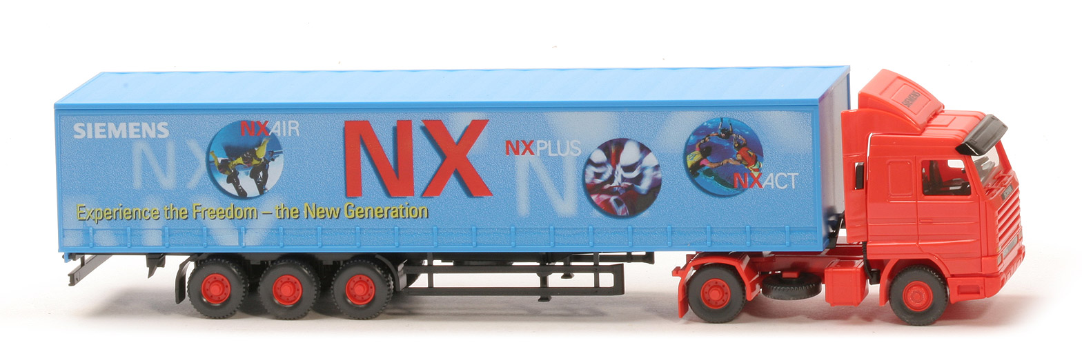 | Zugwagen | Spoiler, Windleitbleche | helles orangerot, Druck "Siemens" schwarz | Kabine | helles orangerot | Ansaugstutzen, Sonnenblende | schwarz | Verglasung | klar | Inneneinrichtung | schwarz, Lenkrad separat | Druck vorne | "Scania" und "143M - 500" jeweils silbern auf schwarz | Scheinwerfer | Druck silbern | Blinker | Druck orange | Stoßstange | helles orangerot | Kabine unten m. Schmutzfänger | helles orangerot | Chassis, Kardanelement | helles orangerot | hier Bodenprägung | neues WIKING-Logo | Sattelpfanne | Teil des Chassis | Kotflügel hinten | helles orangerot | Reserverad | unter Chassis | | Auflieger | Aufbau Dach | ca. himmelblau | Aufbau Korpus | ca. himmelblau | Chassis | schwarz | Kotflügel | schwarz | Unterfahrschutz Seite/hinten | schwarz | Stützen | schwarz | Beschriftung Aufbau Seiten | "Siemens, NX, ..." ... (s. Foto) | | Räder | Typ | 12mm, Felgen eingesetzt | Felgen | 8-Loch, helles orangerot |