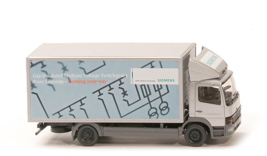 Kabine | silbermetallic lack | Dachspoiler | silbermetallic lack | hier Bedruckung vorne | "Siemens" türkis auf weißer Fläche | Scheibenwischer | schwarz bedruckt | Inneneinrichtung | schwarz, Lkr separat | Blinker | orangetransparent, separat eingesetzt | Scheinwerfer | klartransparent, separat eingesetzt | Grill | schwarz, Stern gesilbert | Kotflügel, Stoßstange | staubgrau | Chassis | schwarz | Kardanelement | schwarz | seitlicher Unterfahrschutz | staubgrau | Kotflügel hinten | staubgrau | Bodenprägung | neues WIKING-Logo | Reserverad | unter Chassis | Koffer Korpus | silbermetallic lack | Koffer Dach | silbermetallic lack | Beschriftung Fahrerseite | " ... Schaltanlagen, ..." (deutsch), s. Foto | Beschriftung Beifahrerseite | " ... Switchgears, ..." (englisch), s. Foto | Beschriftung Heck | " ... Switchgears, ..." (englisch) | Räder | 10 mm, Felgen eingesetzt | Felgen | 8-Loch, schwarz |