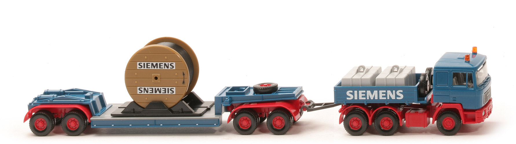 | | Zugmaschine | | Kabine | capriblau, mit 2 Warnlichtern auf Sockel | | eingesetzter Grill | schwarz | | Bedruckung Grill | Rand, MAN-Logo, Löwe silbern | | Inneneinrichtung | ca. lichtgrau, Lkr separiert | | Kabinenunterbau | rot | | Stoßstange, Kotflügel | rot, Scheinwerfer gesilbert | | Chassis | rot | | Kardaneinsatz | rot, Bodenprägung neues WIKING-Logo, Germany | | Radlauf hinten | rot | | Lastpritsche | capriblau | | Bedruckung Pritsche | "Siemens" | | Ladung | 2 Gewichte ca. lichtgrau | | Reserveräder | vorne auf Pritsche | | | Anhänger | | Aufbau | capriblau | | Pritscheneinlage | silbern, mit Dorn | | 2-Achs-Drehschemel | rot | | Doppelachsaggregat Typ | Kotflügel rund, Klipsachsen, rot | | Werkzeugkasten vorne | mit Inhalt | | Reserverad | über Drehschemel | | Bodenprägung Aufbau | Wiking Germany, 503 | | Rückleuchten am Aufbau | mit | | Halterung Kabeltrommel | schwarz | | Kabeltrommel | dunkles braungelb | | Druck | "Siemens" (flacher Druck) s. Foto | | Kabel | schwarz | | | Räder | | Typ | 12 mm, Felgen eingesetzt, schwarz | | Felgen | 8-Loch, rot |