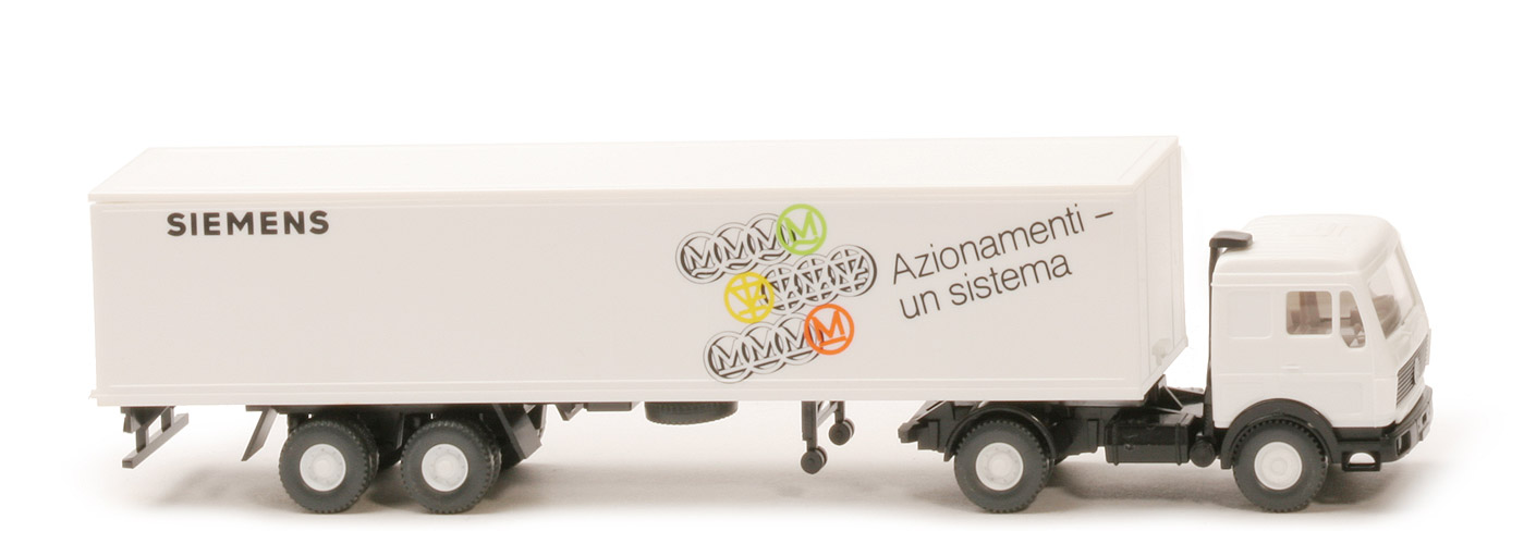| Zugmaschine | Kabine Farbe | weiß | hintere Seitenfenster | geschlossen | Scheibenwischer | mit | Heckfenster | geschlossen | eingesetzter Grill | schwarz, mit MB-Stern, ohne Streifen | Inneneinrichtung | ca. graubeige, Lenkrad integriert | Ansaugstutzen | schwarz, hinter Kabinenrückwand | Stoßstange | schwarz | Chassis | schwarz, BP WIKING | Radlauf hinten | schwarz | Reserverad | ohne | Räder | 12 mm, Profil grob | Felgen | 8-Loch, weiß | | Auflieger | Koffer Korpus | weiß | Dach | weiß | Türen | weiß | Beschriftung Fahrerseite | "... Accionamientos sistematizados ..." | Beschriftung Beifahrerseite | "... Azionamenti - un sistema ..." | Chassis | schwarz | Bodenprägung | WIKING Berlin-W | Unterfahrschutz | mit | DAA Typ | Klipsachsen, Kotflügel eckig | DAA Farbe | schwarz | Hydraulikstütze | schwarz, mit Rollen | Räder | 12 mm, Profil grob | Felgen | 8-Loch, weiß |