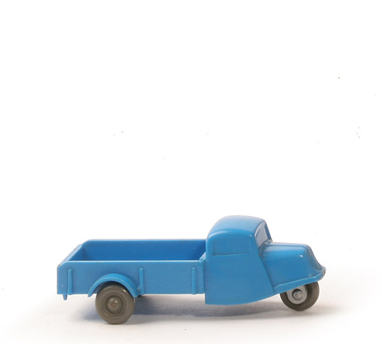 Achsen | Rollachser | Karosserie | himmelblau | Bodenprägung | WM (im Kreis) | vordere Achshalterung | silbern, eingeklebt | Bemalung Scheinwerfer | silber | Bemalung Kennzeichen vorne | silber | Bemalung hinten | ohne | Zughaken | immer ohne | Räder Typ | 8 mm, ohne Profil, Nabe gewölbt | Räder Farbe | ca. staubgrau |