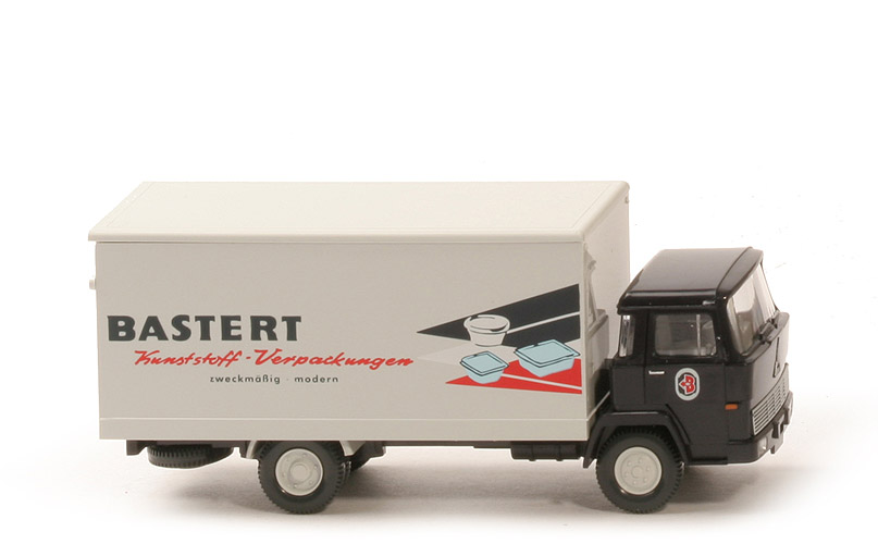Kabine | "schwarzblau", Türen mit Logo | Spiegel/Wischer | mit | Verglasung | klar | Grill | schwarz eingesetzt, Gitter weiß bedruckt | Blinker | orange bedruckt | Inneneinrichtung | 2 Sitze, Motorblock | Armaturenbrett, Lenkrad | mit | Farbe Innenrichtung | helles lichtgrau | Chassis Farbe | schwarz | Bodenprägung | neues WIKING-Logo | Zughaken | ohne | Reserverad | hinten unter Chassis gesteckt | hinterer Kotflügel | ca. altweiß | Aufbau Typ | hoher Koffer | Farbe Koffer | ca. altweiß | Farbe Ladebordwand | ca. altweiß | Farbe Kofferdach | ca. altweiß | Koffer Bodenprägung | ohne (alte Modelle: WIKING Berlin-W) | Beschriftung | Bastert, ... (s. Foto) | Räder | 11mm, Felgen eingesetzt | Felgen | 6-Loch, ca. altweiß |