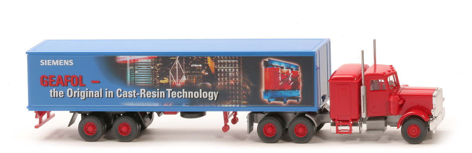| Zugmaschine | Kabine | rot, mit Scheibenwischern | Dach | mit 5 Positionsleuchten | Haube/vordere Kotflügel | rot, kippbar, Blinker auf Kotflügel | Seitenaggregate | rot | Grill, Scheinwerfer, Stoßst. | verchromt, mit Kennzeichen | Schlafkabine | rot | hier Dach | rot | Auspuffrohre, Tanks | verchromt | Chassis, Motor, Kotflügel, ... | silbern | Kardanplatte | silbern | hier Bodenprägung | neues WIKING-Logo, Germany | Sattelpfanne | silbern, für großen Königsbolzen | Bedruckung | ohne | Reserverad | ohne | | Auflieger | Typ | Koffer, Chassis gesteckt | Farbe | ultramarin | Türen | ultramarin | Bedruckung Seiten | "Siemens, Geafol, ..." | weitere Bedruckung | ohne | Chassis | rot, mit Unterfahrschutz | Chassis Bodenprägung | WIKING, Berlin-W | DAA Typ | Klipsachsen, Kotflügel eckig | DAA Farbe | schwarz | Reserverad | unter Chassis gesteckt | Stütze | Rollen, schwarz | | Räder | Typ | 12 mm, 2-teilig, Felgen eingesetzt | Felgen | 8-Loch, rot |