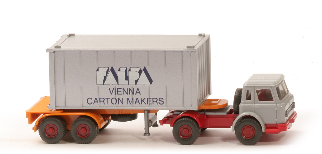Liliput-Container sind Container, die von Liliput als Ladegut verwendet wurden. Sie wurden nicht in Kombination mit WIKING-Sattelzügen angeboten. Diese Kombinationen sind also keine originalen WIKING-Modelle. Hier auf einem IH-Zug. |