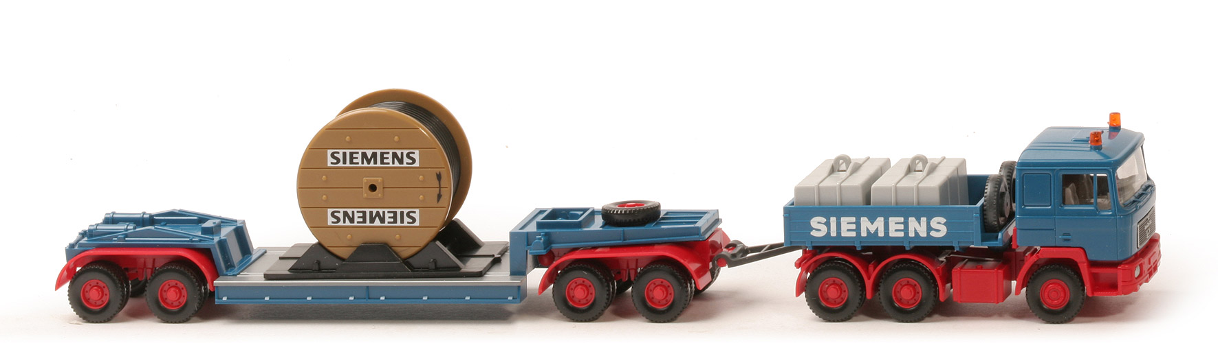 | Zugmaschine | Kabine | capriblau, mit 2 Warnlichtern auf Sockel | eingesetzter Grill | schwarz | Bedruckung Grill | Rand, MAN-Logo, Löwe silbern | Inneneinrichtung | ca. lichtgrau, Lkr separiert | Kabinenunterbau | rot | Stoßstange, Kotflügel | rot, Scheinwerfer gesilbert | Chassis | rot | Kardaneinsatz | rot, Bodenprägung neues WIKING-Logo, Germany | Radlauf hinten | rot | Lastpritsche | capriblau | Bedruckung Pritsche | "Siemens" kleinere Lettern | Ladung | 2 Gewichte ca. lichtgrau | Reserveräder | vorne auf Pritsche | | Anhänger | Aufbau | capriblau | Pritscheneinlage | silbern, mit Dorn | 2-Achs-Drehschemel | rot | Doppelachsaggregat Typ | Kotflügel rund, Klipsachsen, rot | Werkzeugkasten vorne | mit Inhalt | Reserverad | über Drehschemel | Bodenprägung Aufbau | Wiking Germany, 503 | Rückleuchten am Aufbau | mit | Halterung Kabeltrommel | schwarz | Kabeltrommel | dunkles braungelb | Druck | "Siemens" (flacher Druck) s. Foto | Kabel | schwarz | | Räder | Typ | 12 mm, Felgen eingesetzt | Felgen | 8-Loch, rot |