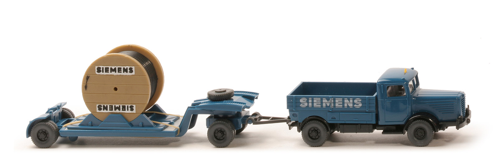 | Zugmaschine | Kabine | capriblau | Verglasung | klar | Inneneinrichtung | ca. graubeige | Bedruckung Scheinwerfer | ohne | Bedruckung Grill | ohne | Warndreieck | gelb | Koflügel vorne | schwarz | Chassis Farbe | schwarz | Sattelpfanne | für großen Königsbolzen | Bodenprägung | WIKING, Berlin-W | Zughaken | stark | Reserverad | ohne | Koflügel hinten | schwarz | Pritsche | capriblau, Druck seitlich "Siemens" | Pritscheneinlage | ohne | Räder Typ | 12 mm, Felgen eingesetzt | Felgen | 8-Loch, schwarz | | Anhänger | Grundfarbe | capriblau | gesteckte Rampe | capriblau | gesteckter Radsatz | capriblau | Pritsche | silbern, ohne Dorn | Bodenprägung | WIKING, Germany | Drehschemel | capriblau, Befestigung über Weichzapfen | Reserverad | über Drehschemel | Trommelhalterung | capriblau | Trommel | ca. rotelfenbein, Thermodruck "Siemens" | Kabel | schwarz | Räder Typ | 12 mm, Felgen eingesetzt | Felgen | 8-Loch, schwarz |