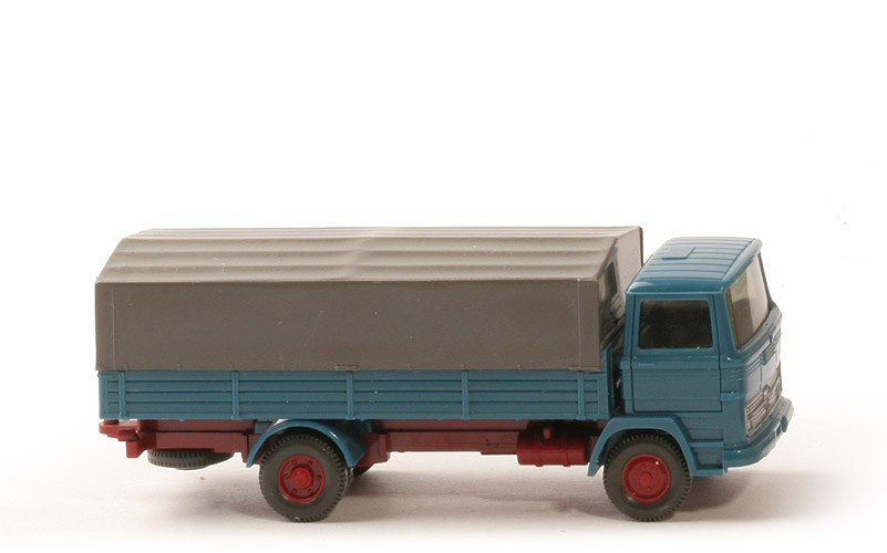 Farbe Kabine | azurblau | Spiegel | ohne | Verglasung | getönt | Grill | silbern eingesetzt | Bemalung | ohne | Inneneinrichtung | 2 Sitze, Motorblock | Armaturenbrett, Lenkrad | ohne | Farbe Innenrichtung | ca. gelbgrau | Chassis Farbe | hellbraunrot, glänzend | Bodenprägung | GERMANY, WM | Zughaken | mit | Reserverad | hinten unter Chassis gesteckt | hinterer Kotflügel | azurblau | Pritsche Farbe | azurblau | Pritscheneinlage | silbern | Bemalung Rückleuchten | ohne | Plane | flach (Höhe 11 mm), hinten offen | Farbe Plane | ca. steingrau | Räder | 11mm, Felge eingesetzt | Felgenfarbe | hellbraunrot |
