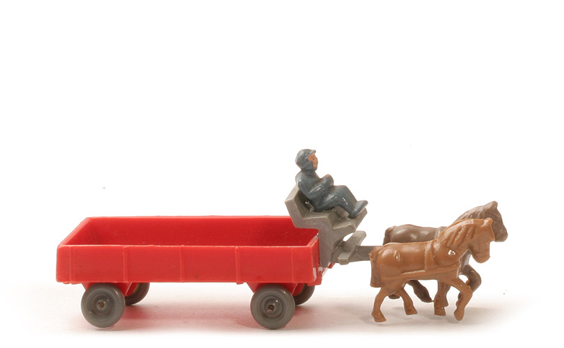 Räder | Drahtachser | Pritschentyp | ohne Querverbretterung | Farbe Pritsche | blassrot | Deichselrest | mit | Pritschenboden | mit Struktur | Zughaken | integriert, nach unten | Deichsel/Kutschbock | platingrau | Quersteg Deichsel | mit | Farbe linkes Pferd | blassbraun | Farbe rechtes Pferd | ockerbraun | Kutscher Typ | Mütze | Kutscher Farbe | ca blaugrau uni | Kutscher Bemalung | Gesicht | Räder | ca. staubgrau |
