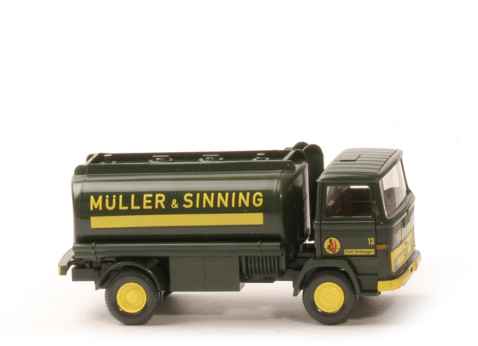 Kabine | flaschengrün | Spiegel | mit | Grill | schwefelgelb | Verglasung | klar | Inneneinrichtung | ca. anthrazit | Lenkrad | integriert | Chassis | schwarz, BP Germany, WM | Kardaneinsatz | schwarz, BP neues WIKING-Logo | Zughaken | ohne | Radlauf hinten | flaschengrün | Tank | flaschengrün | Füllanlage | flaschengrün | Tankunterbau | flaschengrün | Beschriftung Tank Seite | Müller und Sinning | Räder | 11mm, 2-teilig | Felgen | schwefelgelb | | weitere Bedruckungen | Stoßstangen | schwefelgelb | Front | "Müller & Sinning" | Grill | Umrandung, Zierlinie, Stern, Scheinwerfer silbern | Blinker vorne | orange | Türen | Logo, "Funk Tankwagen", "13" | Rückleuchten | auf Stoßstange rot eingedruckt | Tank hinten | "Müller & Sinning, Frankfurt/Main,Eyssenstr. 3-5, 490401" |