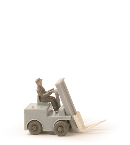 Farbe Aufbau | silbergrau | Fußbodenfläche | glatt | Bohrlöcher als Dachaufnahme | ohne | Lenkrad | silbergrau, 4-speichig | eingesetztes Chassis | silbergrau | hier Bodenprägung | WM | Hubgestell | silbergrau | Hubarme | weiß | Fahrer | olivgrün | Bemalung Fahrer | Gesicht und Hände | Räder Farbe | ca. staubgrau | Räder vorne | 7 mm, Doppelbereifung | Räder hinten | 7 mm, Einfachbereifung |