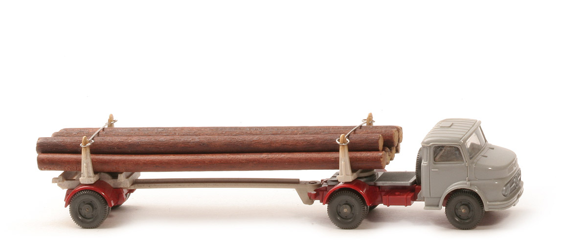 | Zugmaschine | Farbe Kabine | achatgrau | Lüfter | mit | Eckfenster | mit | Blinker | auf Kotflügel | Verglasung | klar | Inneneinrichtung | ca. hellgelbgrau | Chassis | weinrot | Radlauf hinten | weinrot | Sattelpfanne | für großen Königsbolzen | Reserverad | hinter Kabine | Räder | 11mm, einteilig, Profil fein | | Auflieger | Rungen | hellelfenbein | Deichsel | hellelfenbein | Gestaltung Deichsel | Zughaken übergreifend | Radlauf | weinrot | Königsbolzen | stark | Reserverad | unter Chassis | Räder | 11mm, einteilig, Profil fein | Ladung | 7 Baumstämme | Befestigung der Ladung | Drahtschlaufen |