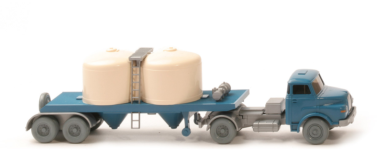 | Zugmaschine | Farbe Kabine | azurblau | Verglasung | getönt | Inneneinrichtung | ohne | Grill Ausführung | Druck, schwarz, silbern | hier Beschriftung | MAN, Diesel | Bedruckung Front | Scheinwerfer, Zierlinien silbern, Blinker gelborange | Chassis | silbern | Kardanelement | silbern | Bodenprägung | neues WIKING-Logo | Werkzeugkiste | silbern | Reserverad | ohne | Sattelpfanne | alt, mit Steg, für großen KöBo, ähnlich | Räder Typ | 12 mm, einteilig, 10 Loch | Räder Farbe | ca. staubgrau | | Auflieger | Tanks | ca. creme | Basis | azurblau | Königsbolzen | stark | Bodenprägung Auflieger | WIKING (altes Logo), WIKING (neues Logo), 53 n | Leitern | silbern | Pumpeinheit | silbern | Achseinheit | silbern | Typ Achseinheit | neues Wiking-Logo | Stützrollen | azurblau | Reserverad | hinten senkrecht auf Achseinheit | Beschriftung | ohne | Räder Typ | 12 mm, einteilig, 10 Loch | Räder Farbe | ca. staubgrau |