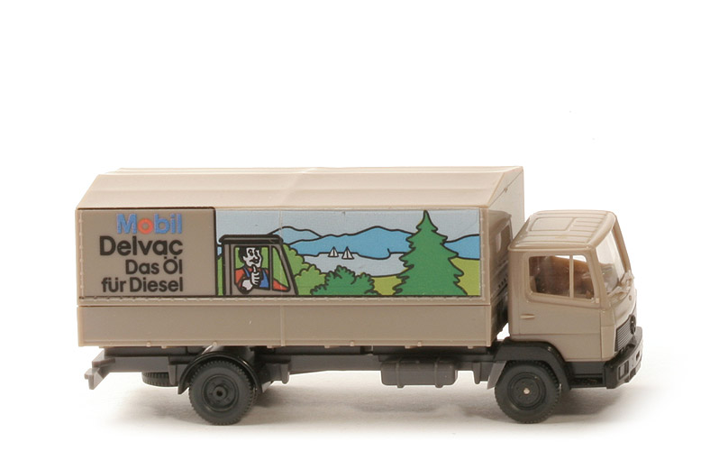 | Kabine | graubeige | | Fensterstrebe | Teil des Verglasung | | Grill | schwarz, eingesetzt | | Grillbedruckung | ohne | | Inneneinrichtung | graubeige, Lkr integriert | | Kotflügel, Stoßstange | schwarz | | Chassis | staubgrau | | Kotflügel hinten | schwarz | | Bodenprägung | WIKING, Berlin-W | | Reserverad | unter Chassis | | Pritsche | graubeige | | Pritscheneinlage | Pappe, silbern | | Verdeck | graubeige | | Bedruckung Plane seitlich | "Mobil - Delvac - Das Öl für Diesel, ..." (s. Foto) | | Bedruckung Plane hinten | "Gute Fahrt mit Mobil Delvac" | | Räder | 10 mm |