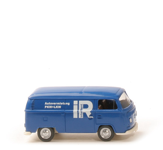 Neuauflage mit Lenkrad. Auftragsmodell für das Bulli-Museum. Den T2 Kasten Interrent gab es mit weißem Chassis im Doppelpack mit einem T3 Kasten. Dieses Modell kommt in Vitrinenbox mit schwarzem Sockel und Aufdruck weiß "SU", "Autovermietung", 1. März 1970", "Selbstfahrerunion wird zu SUinterRent" und IR-Logo in neutralem weißen Umkarton. Eine Kleinstauflage aus WIKING-Überbeständen. |