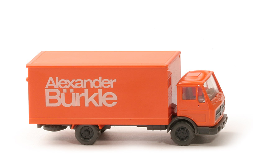 | Kabine | helles leuchtorange | | Spiegelaufnahmen | mit | | Grill | eingesetzt, mit Silberstreifen neben Stern | | Verglasung | klar | | Inneneinrichtung | Lenkrad integriert, ca. graubeige | | Stoßstange, vorderer Kotflügel | anthrazit | | Typ vorderer Kotflügel | ohne Wulst, mit Blinkern | | Scheinwerfer | unbemalt, mit integrierten Blinkern | | Chassis | anthrazit | | Kardaneinsatz | anthrazit | | Bodenprägung | Germany, WM | | Reserverad | hinten unter Chassis | | Kotflügel hinten | helles leuchtorange | | Rückleuchten | unbemalt | | Aufbau Typ | hoher Koffer | | Farbe Koffer | helles leuchtorange | | Farbe Ladebordwand | helles leuchtorange | | Farbe Kofferdach | helles leuchtorange | | Bodenprägung Koffer | WIKING, Berlin-W | | Beschriftung | "Alexander Bürkle" (s. Foto) | | Beschriftung Art | Druck weiß | | Räder | 11mm, Felgen eingesetzt | | Felgen | 6-Loch, schwarz |