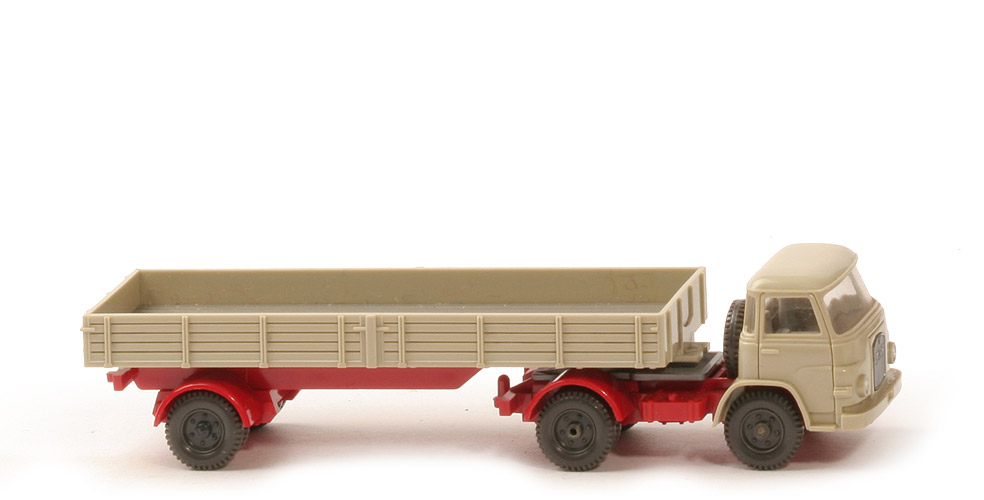 | Zugmaschine | Kabine | hellgelbgrau | Verglasung | leicht getönt | Inneneinrichtung | ca. lichtgrau | Grill | silbern | Farbe Chassis | rot | Bemalung | Scheinwerfer silbern | Sattelpfanne | neu, für dünnen Bolzen | Bodenprägung | WM Germany | Reserverad | hinter Kabine | Räder | 11mm 6 Loch | | Auflieger | Pritsche Art | Holzpritsche | Pritsche Farbe | hellgelbgrau | Chassis | rot | Bodenprägung | Wiking/Germany | Königsbolzen | dünn | Pritscheneinlage | betongrau | Ladung | ohne | Räder | 11mm 6 Loch |