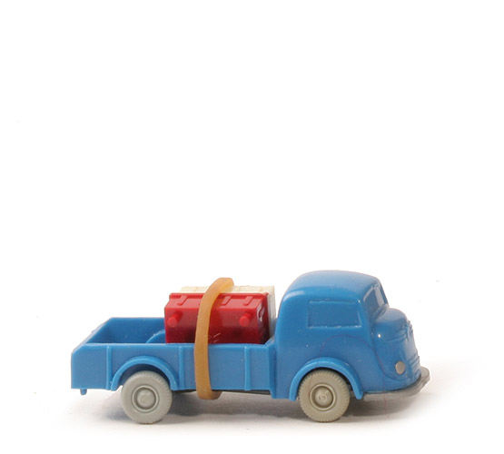 Achsen | Rollachser | Karosserie | himmelblau | Chassis Farbe | silbern | Bodenprägung | WM (im Kreis) | Schlepploch | mit | Bemalung Scheinwerfer | silbern | Bemalung Heck | ohne | Zughaken | immer ohne | Räder Typ | 8 mm, mit Profil | Räder Farbe | ca. lichtgrau | Ladung | große Staplelkästen helles cremeweiß und rot | Bodenprägung Stapelkästen | WM |