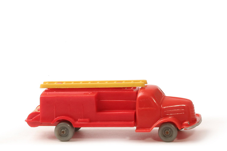 Achsen | Drahtachser | Farbe Kabine u. Chassis | orangerot | Bemalung Kabine | Scheinwerfer und Stoßstange silbern | Version Chassis | mit Schlitz | Bodenprägung | WM | Aufbau Farbe | orangerot | Aufbau Typ | mit Stegen zum Aufstecken der Leiter | Leiter | gelb, aufgesteckt | Räder | 9 mm, ohne Profil |