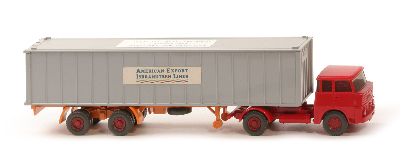 | Zugmaschine | Kabine oben | rot | Kabine unten | rot | Verglasung | getönt | Chassistyp | neu | Zughaken | ohne | Fläche hinter Sattelpfanne | geriffelt | Chassisfarbe | rot | Sattelpfanne | für großen Königsbolzen | Reserverad | ohne | Räder | 12mm, Profil grob | Felgen | hellbraunrot | | Container | Art | 1 x 40 ft, gerippt | Dach | silbergrau | Korpus | silbergrau | Türen | silbergrau | Unterkante | breit | Beschriftung | American Export ... (s. Foto) | Beschriftung Größe | 5 Felder, Papieraufkleber | | Auflieger | Farbe | gelborange (Werbe) | Unterfahrschutz | ohne | Königsbolzen | stark | Räder | 12mm, Profil grob | Felgen | hellbraunrot |