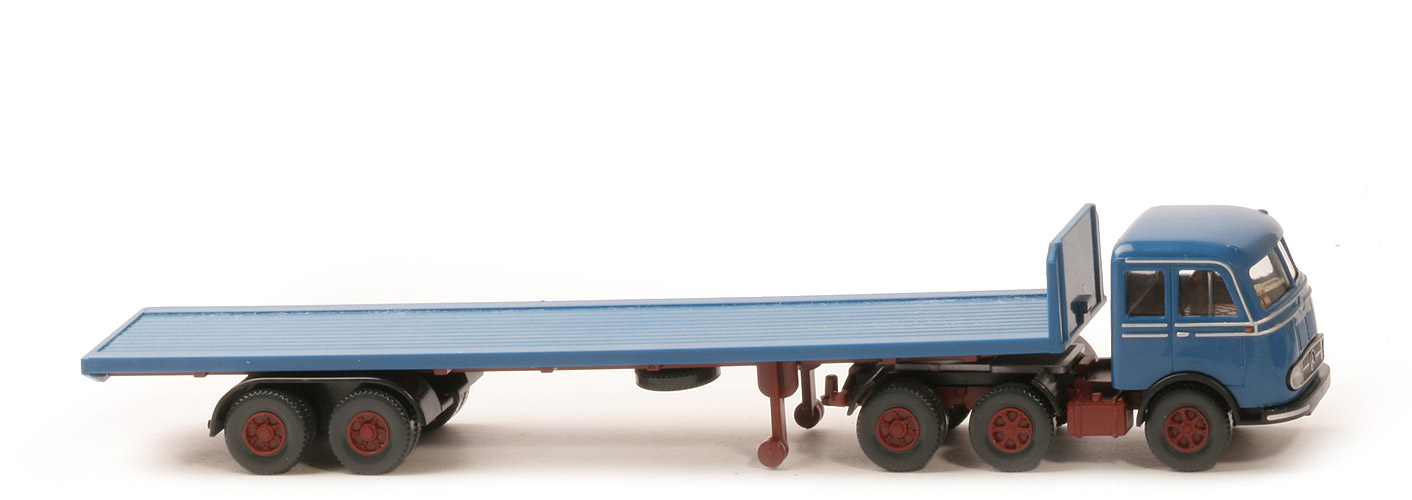 | | Zugwagen | | Fahrerhaus | ca. kobaltblau | | Bedruckung Fahrerhaus | Zierlinien, Türgriffe, Stern silbern, Blinker orange | | Grill | eingesetzt, schwarz | | Bedruckung Grill | Grillumrandung, Stern, Scheinwerfer, Zierlinie silbern | | Verglasung | klar | | Inneneinrichtung | ca. lehmbraun | | Lenkrad | separat eingesetzt, ca. cremeweiß | | Kotflügel vorne / Stoßstange | schwarz | | hier Bedruckung | Seitenzierleiste gesilbert | | Chassis, Kardaneinsatz | rotbraun | | Bodenprägung | neues Wiking-Logo | | Kotflügel hinten | schwarz | | Sattelpfanne | für großen Königsbolzen | | Zughaken | integriert | | | Auflieger | | Pritsche | ca. kobaltblau | | Chassis | rotbraun | | DAA Typ | Klemmplatte Wiederauflage | | DAA Farbe | schwarz | | Stütze | rotbraun | | Reserverad | mittig unter Chassis | | | Räder | | Typ | 12 mm, Felgen eingesetzt | | Felgen | Trilex neu, rotbraun |