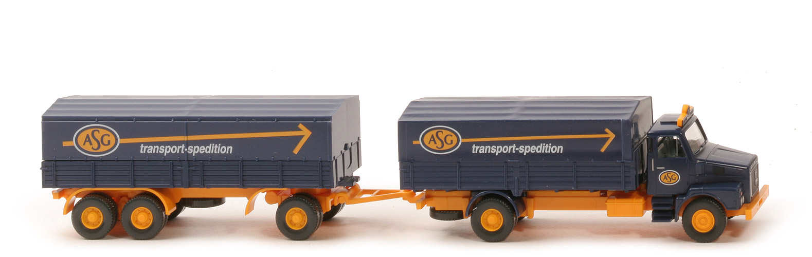 Kabine | "saphirblau" | Dachschild | gelb, Druck "saphirblau" | Verglasung | klar | Inneneinrichtung | ca. platingrau, Lkr integriert | eingesetzter Grill | schwarz | Scheinwerfer | gesilbert | Bedruckung vorne | "Volvo", Grillumrandung, Logo silbern | Bedruckung Türen | ASG-Logo | Chassis | melonengelb | Kardaneinsatz | melonengelb | Bodenprägung | WIKING, Germany (neu) | Radlauf hinten | "saphirblau" | Reserverad | hinten unter Chassis, gesteckt | Pritsche Typ | Holzpritsche | Pritsche Farbe | "saphirblau" | Pritscheneinlage | ca. silbergrau | Plane | "saphirblau" | Bedruckung Plane | ASG ... (s. Foto) | Räder | 12 mm, Felgen eingesetzt | Felgen | 8-Loch, melonengelb | | Anhänger | Pritsche Typ | Holzpritsche | Pritsche Farbe | "saphirblau" | Pritscheneinlage | ca. silbergrau | Chassis | melonengelb | Achsaufhängungen | für Doppelbereifung | Bodenprägung | "40d" unter Drehschemel, neues WIKING-Logo | Plane | "saphirblau" | Bedruckung Plane | ASG ... (s. Foto) | Räder | 12 mm, Felgen eingesetzt | Felgen | 8-Loch, melonengelb |