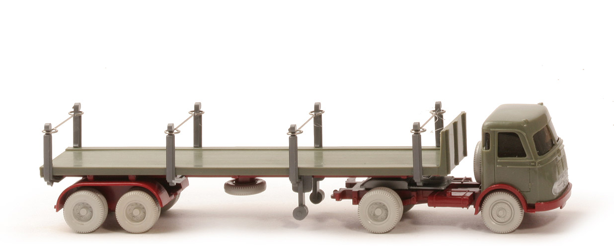 | Zugmaschine | Kabine Farbe | blasses hellolivgrün | Fenstersteg | breit | Fixierung Reserverad | mit | Verglasung | stark getönt | Inneneinrichtung | ohne | Grill | integriert, gesilbert | Chassis | hellbraunrot | Bodenprägung | neues Wiking-Logo | hintere Stoßstange links | mit | Zughaken | mit | hintere Stoßstange rechts | mit | Reserverad | hinter Kabine | Sattelpfanne | alt, mit Steg, für großen KöBo, ähnlich | Räder | 10-Loch, ca. grauweiß | | Auflieger | Farbe | blasses hellolivgrün | Bodenprägung | neues WIKING-Logo, 51r | Königsbolzen | stark | Chassis | hellbraunrot | Achseinheit Farbe | hellbraunrot | Typ Achseinheit | Klemmplatte Wiederauflage | Reserverad | unter Auflieger | Rungen | basaltgrau | Rückleuchten | unbemalt | Räder | 10-Loch, ca. grauweiß |