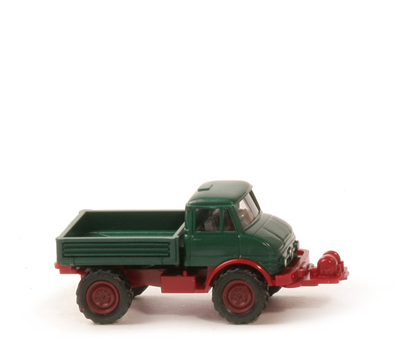 Sechste Edition aus dem "kleinen WIKING-Laden". Offizielle Bezeichnung: Unimog U800/403 „Forstmeister“. Als Zubehör beigefügt sind 2 Gelblichter und Sockel in Karosseriefarbe und eine Seilwindeneinheit (siehe Erdbeweger) in rubinrot. Sehr schön filigran gedruckter Unimog- Schriftzug an der Front.