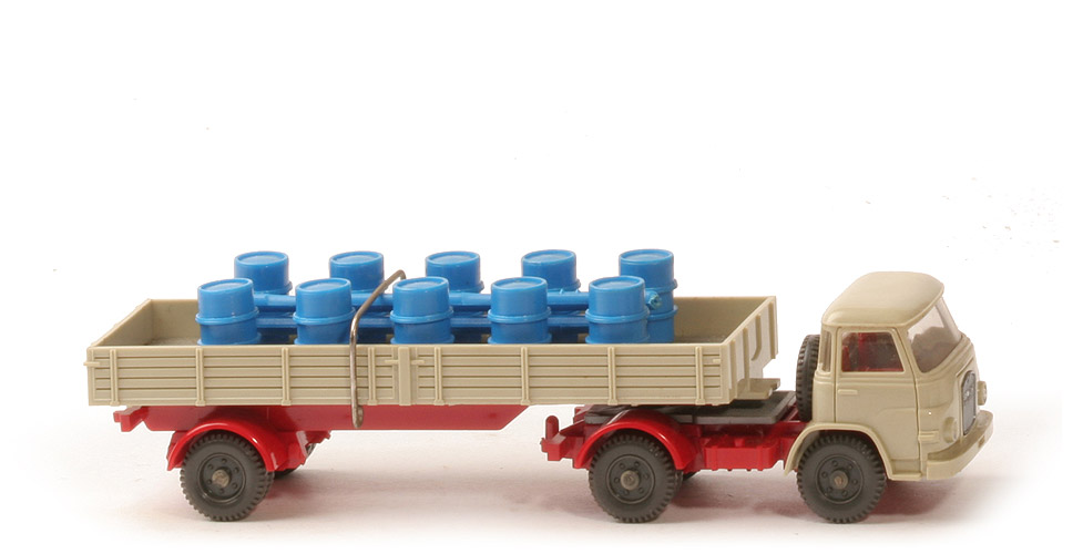 | Zugmaschine | Kabine | hellgelbgrau | Verglasung | klar | Inneneinrichtung | weinrot | Grill | silbern | Farbe Chassis | rot | Bemalung | Scheinwerfer silbern | Sattelpfanne | neu, für dünnen Bolzen | Bodenprägung | WM Germany | Reserverad | hinter Kabine | Räder | 11mm 6 Loch | | Auflieger | Pritsche Art | Holzpritsche | Pritsche Farbe | hellgelbgrau | Chassis | rot | Bodenprägung | Wiking/Germany | Königsbolzen | dünn | Pritscheneinlage | betongrau | Ladung | 10 Öltonnenhälften am Spritzling | Farbe Ladung | lichtblau | Räder | 11mm 6 Loch |