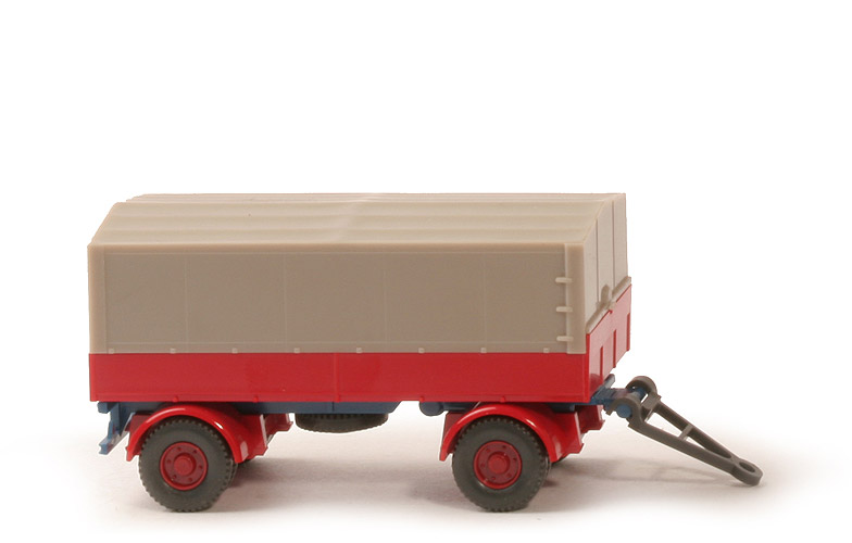 Pritsche | rot | Chassis | capriblau, Kennzeichen breit | Radläufe | Typ 3, rot | Reserverad | mittig unter Chassis | Pritscheneinlage | Papier weiß, schwarze Längsstreifen | Deichsel | Kunststoff anthrazit | Plane | helles graubeige, hinten geschlossen | Räder | 12mm, Profil grob | Felgen | 6-Loch, hellbraunrot |