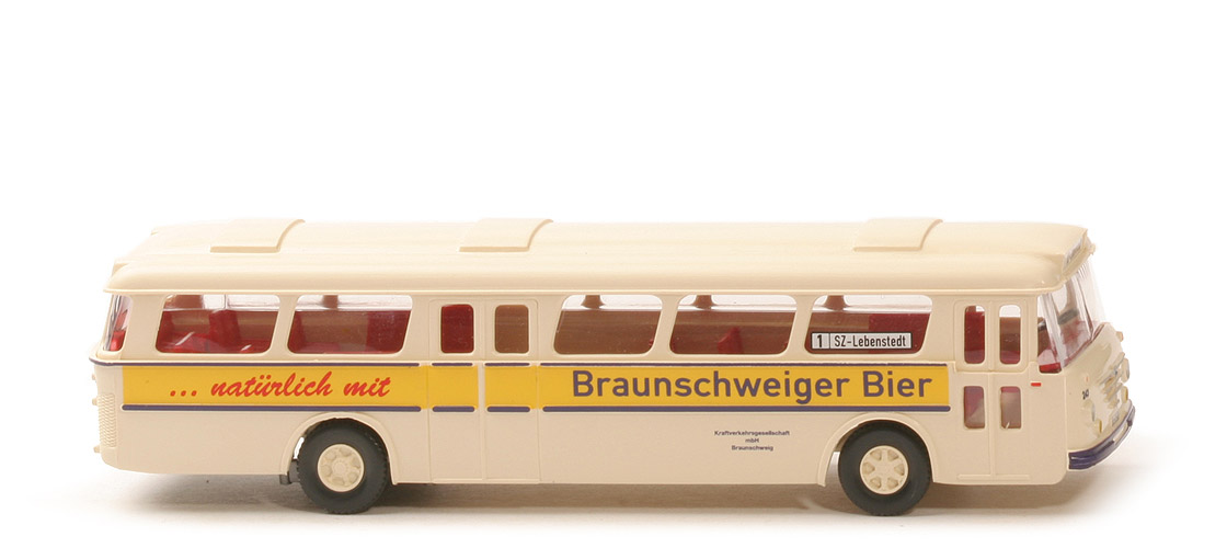 Sehr hübsch bedrucktes Sondermodell Edition Braunschweig - exklusiv für Region im Modell KG. Weitere Bedruckung: Zielschild neben Eingangstür "1 | SZ-Lebenstedt", Blinker seitlich vorne rot, vorne und hinten links und rechts jeweils "243", Heckfenster Liniennummer "1", Büssing-Logo am Heck.