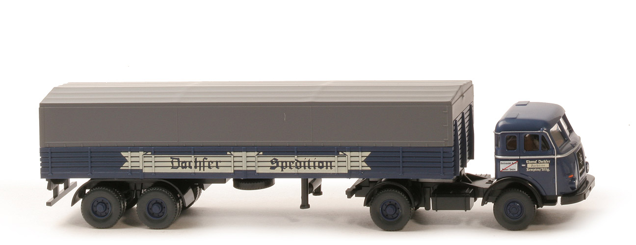 Sondermodell für Dachser, das in Restbeständen von Reinhardt Spielwaren vertrieben wurde (Nr. WIWFS54303700000). Erstmals gibt es hier das neue Fahrerhaus auf einem 2-Achs-Chassis. Sattelzüge aus der Zeit des Originals hatten eher noch keinen Unterfahrschutz.