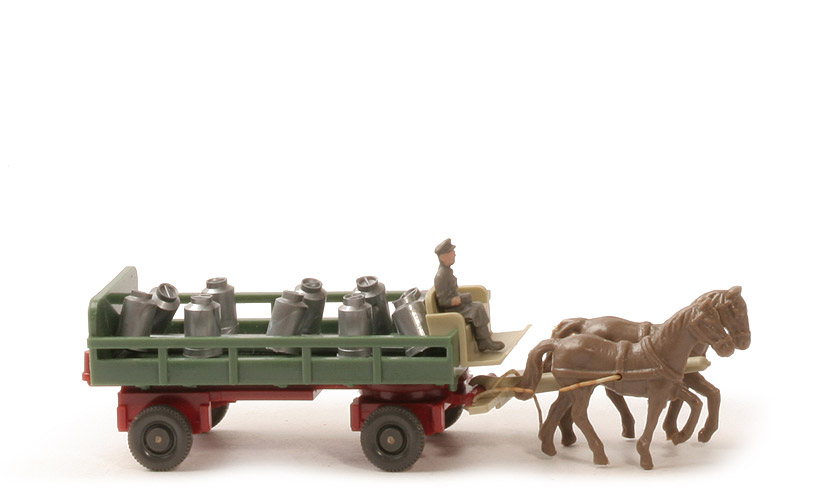 Typ | Rollachser | Farbe Pritsche | diamantgrün | Pritschentyp | mit Rückleuchten und hinterem Kennzeichen | Chassis | hellbraunrot, mit Zughaken, Normchassis Typ 5 | Chassis Bodenprägung | WIKING, Germany | Drehschemel | hellbraunrot | Befestigung Drehschemel | Bajonettverschluss | Achshalterungen | offen | Kutschbock | ca. hellgelbgrau, verstärkte Vorderkante | Deichsel | ca. hellgelbgrau, neue Befestigungs-Konstruktion | Farbe linkes Pferd | braun | Farbe rechtes Pferd | braun | Kutscher Farbe | ca. basaltgrau | Kutscher Bemalung | Gesicht, Hände | Ladung | 10 Milchkannen am Spritzling | Räder | 9 mm (!) |