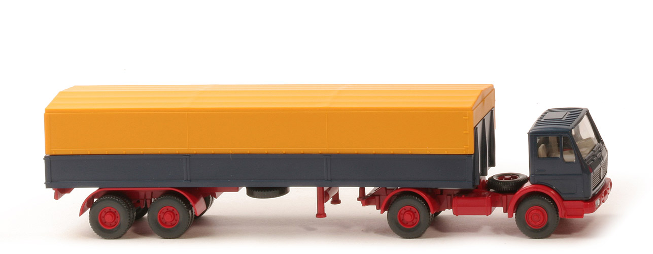 | Zugmaschine | Farbe Kabine | stahlblau | Spiegelaufnahmen | ohne | Grill | schwarz, mit Stern, ohne Streifen | Inneneinrichtung mit Lenkrad | ca. hellelfenbein | Scheibenwischer | mit | Kotflügel vorn | rot mit Wulst | Chassis | rot | Bodenprägung | WIKING (altes Logo!) | Reserverad | auf Chassis liegend (11 mm!) | Sattelpfanne | für großen Königsbolzen | Radlauf hinten | rot | Räder | 12mm, Profil grob | Felgen | 8-Loch, rot | | Auflieger | Pritsche Typ | Alupritsche | Pritsche Farbe | stahlblau | Pritscheneinlage | ca. silbergrau | Chassis Typ | eingesteckt, ohne Unterfahrschutz | DAA Typ | Version 4a Klipsachsen Kotflügel rund | DAA Farbe | rot | Bodenprägung Chassis | neues Wiking-Logo | Plane | ca. orangegelb | Reserverad | unter Chassis | Räder | 12mm, Profil grob | Felgen | 8-Loch, rot |
