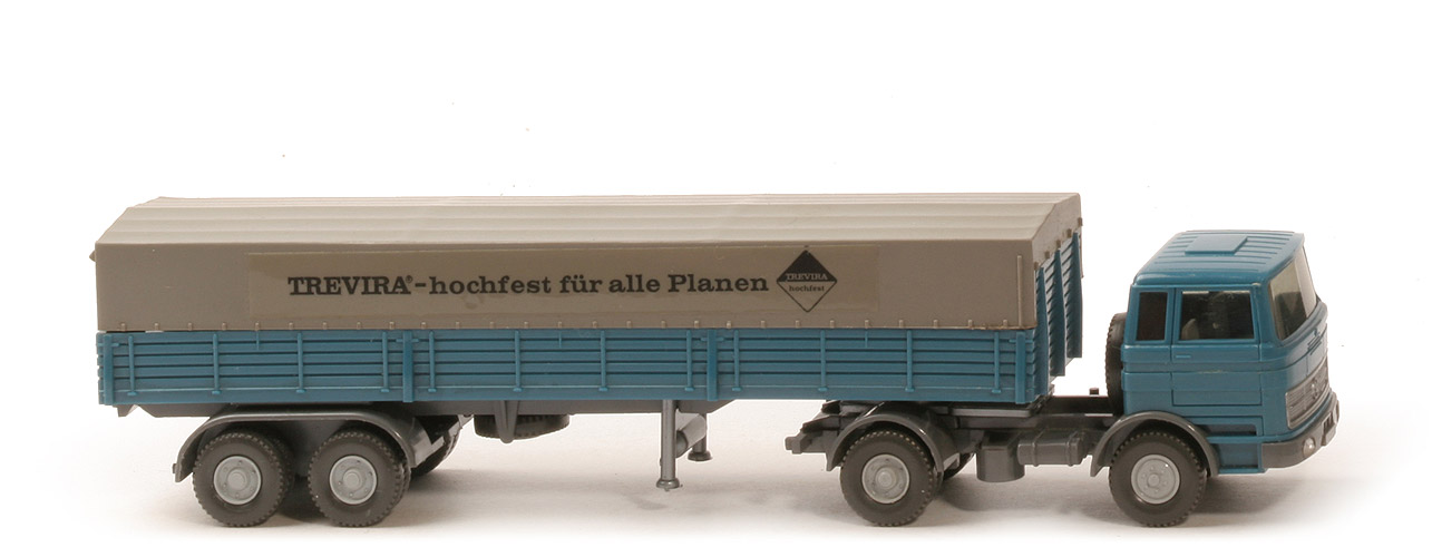 | Zugmaschine | Kabine oben | azurblau | Kabine unten | azurblau | Streifen | ohne | Verglasung | getönt | Inneneinrichtung | ca. lichtgrau | Lenkrad | ohne | Grill | silbern | Stoßstange, Radlauf vorn | basaltgrau | Chassistyp | neu | Chassisfarbe | basaltgrau | Radlauf hinten | basaltgrau | Reserverad | hinter Kabine | Sattelpfanne | für großen Königsbolzen | Räder | 12mm, Profil grob | Felgen | silbergrau | Beschriftung Kabine | ohne | | Auflieger | Farbe Pritsche | azurblau | Pritschentyp | ohne Lasche | Chassis | basaltgrau | Pritscheneinlage | ca. olivgrau | Achseinheit | basaltgrau | Bodenprägung Achseinheit | Germany/Wiking | Königsbolzen | stark | Plane | Seite glatt, vorne Aussparung | Plane Farbe | ca. steingrau | Räder | 12mm, Profil grob | Felgen | silbergrau | Beschriftung | TREVIRA (deutsch) | Art der Beschriftung | Folienaufkleber |