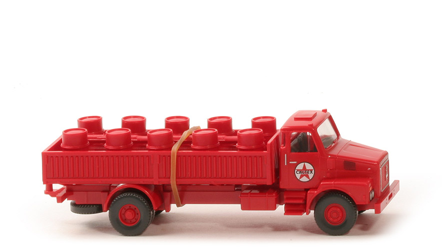 Kabine | rot | Bedruckung Türen | Caltex-Logo, Türgriffe, Haltegriffe silbern | Verglasung | klar | Inneneinrichtung | schwarz, Lkr integriert | eingesetzter Grill | rot | Scheinwerfer | gesilbert, schwarz gefasst | Bedruckung vorne | "Volvo", Grillumrandung, Logo silbern | Chassis | rot | Kardaneinsatz | rot | Bodenprägung | WIKING, Germany (neu) | Radlauf hinten | rot | Reserverad | hinten unter Chassis, gesteckt | Pritsche Typ | Stahlpritsche | Pritsche Farbe | rot | Pritscheneinlage | ca. silbergrau | Ladung | 10 Fässer am Spritzling, rot | Sicherung Ladung | Gummiband | Räder | 12 mm, Felgen eingesetzt | Felgen | 8 Loch, rot |