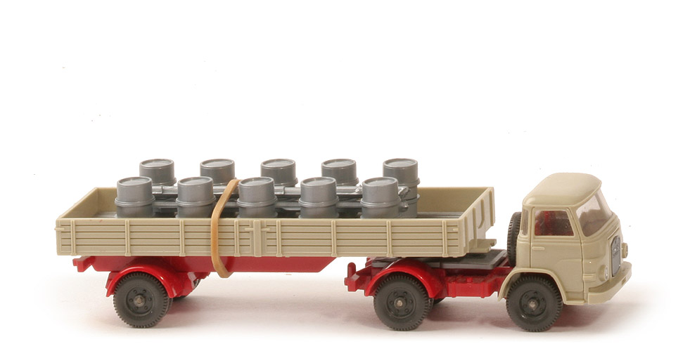 | | Zugmaschine | | Kabine | hellgelbgrau | | Verglasung | klar | | Inneneinrichtung | weinrot | | Grill | silbern | | Farbe Chassis | rot | | Bemalung | Scheinwerfer silbern | | Sattelpfanne | neu, für dünnen Bolzen | | Bodenprägung | WM Germany | | Reserverad | hinter Kabine | | Räder | 11mm 6 Loch | | | Auflieger | | Pritsche Art | Holzpritsche | | Pritsche Farbe | hellgelbgrau | | Chassis | rot | | Bodenprägung | Wiking/Germany | | Königsbolzen | dünn | | Pritscheneinlage | silbern | | Ladung | 2x 10 Öltonnenhälften an Spritzlingen | | Farbe Ladung | blasses silbern | | Fixierung der Ladung | Gummiband | | Räder | 11mm 6 Loch |