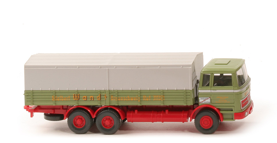 | Fahrzeug | Kabine oben | ca. resedagrün | Kabine unten | ca. resedagrün | Streifen | silbern | Verglasung | klar | Inneneinrichtung | anthrazit | Lenkrad | integriert | Stoßstange, Radlauf vorn | "karminrot" | Chassisfarbe | "karminrot" | Radlauf hinten | 2-teilig, "karminrot" | Reserverad | unter Chassis gesteckt | Pritsche | ca. resedagrün | Pritscheneinlage | silbern | Plane | ca. lichtgrau | Räder | 12mm, Profil grob | Felgen | 8-Loch, "karminrot" |